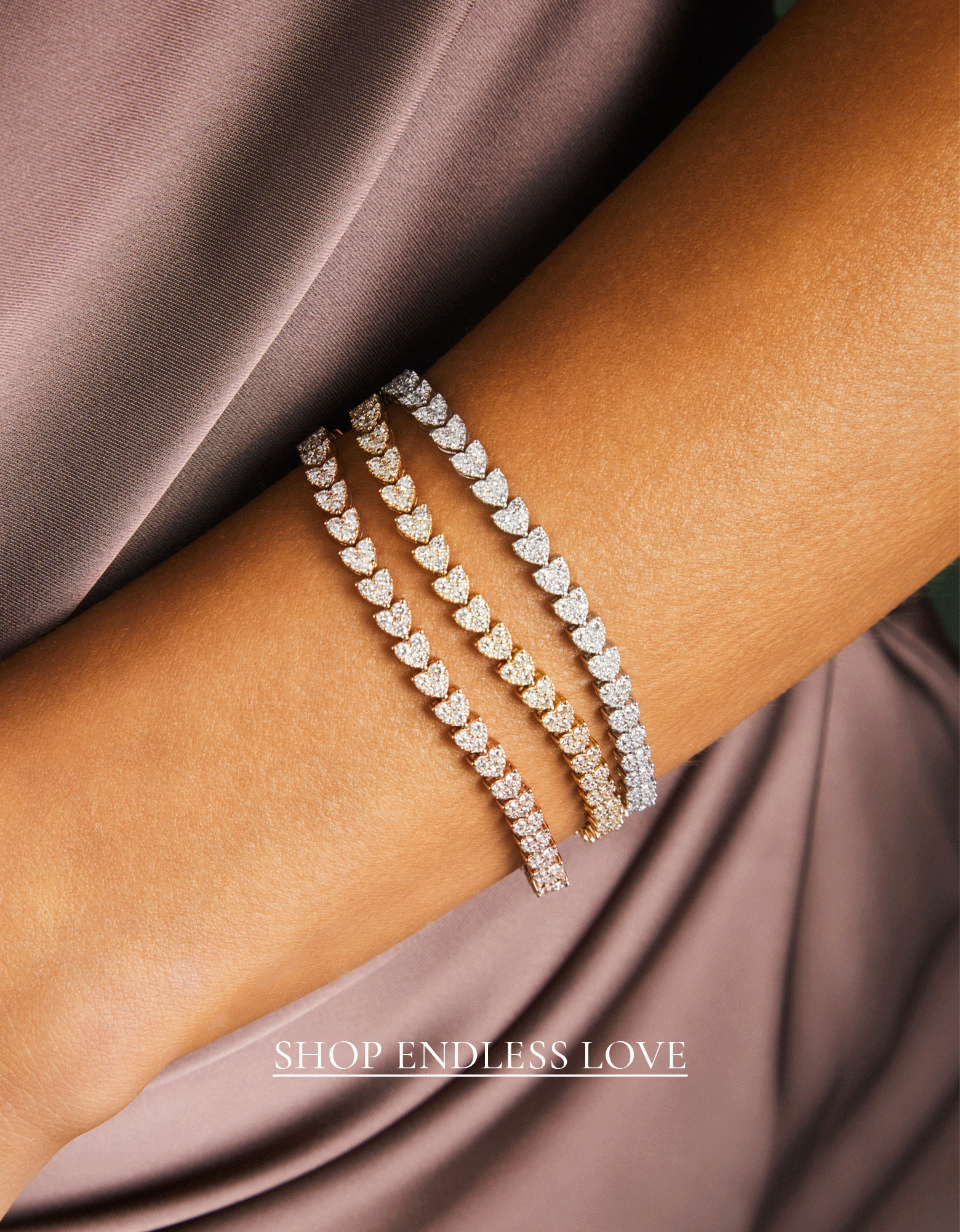 View full detailsThe Endless Love Eternity Bracelet glimmers with 3.2 carats of full cut diamonds set to create consecutive heart shapes that wrap all the way aroun...